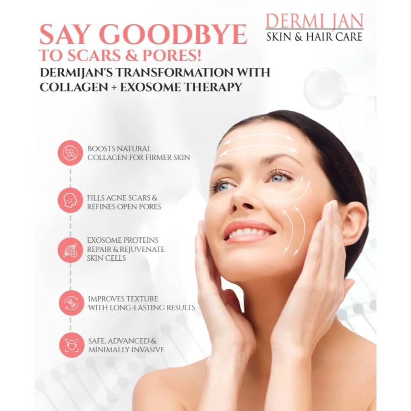 Acne Treatment in Adyar Say goodbye to stubborn scars & open pores! At DERMIJAN Skin & Hair Care, our advanced Collagen + Exosome Therapy boosts natural collagen, repairs skin cells, fills acne scars, and refines pores for a flawless glow