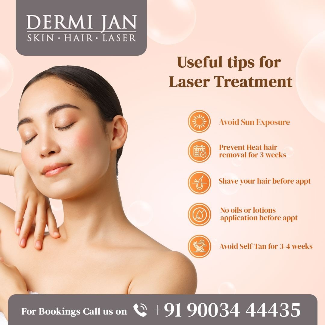 Laser Hair Removal Treatment in Adyar Chennai 🌟 Prepare for your laser treatment with these essential tips: Shield from Sun: Minimize sun exposure pre-treatment. Skip Heat: Avoid heat hair removal for 3 weeks prior. Shave Ahead: Ensure hair is shaved before your appointment. Go Au Naturel: Refrain from applying oils or lotions. Banish Tans: Steer clear of self-tanning products for 3-4 weeks. . Follow these guidelines for optimal results! . Dermi Jan Skin Hair & Laser Clinic . 4.9 ⭐⭐⭐⭐⭐ in Google review .
